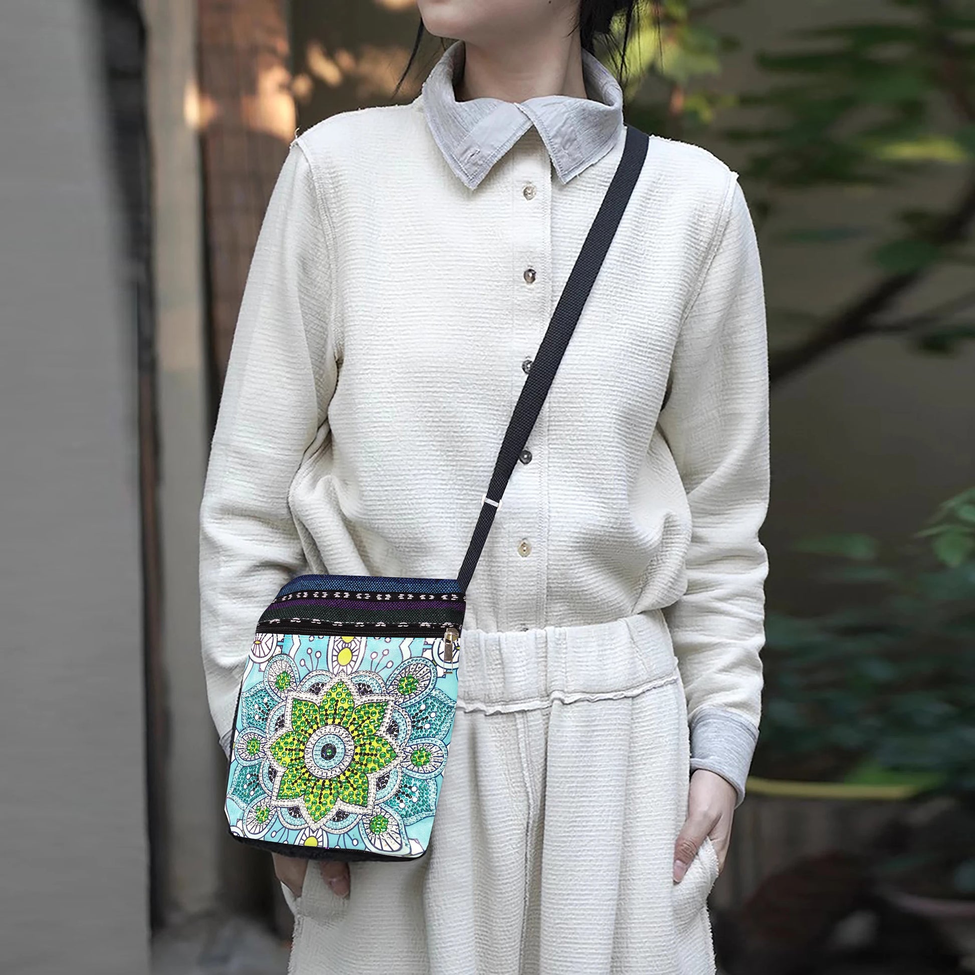Pintura Terapêutica com Diamantes - Bolsa com Alça - Mandala Azul e Verde - Tela 100% Preenchida