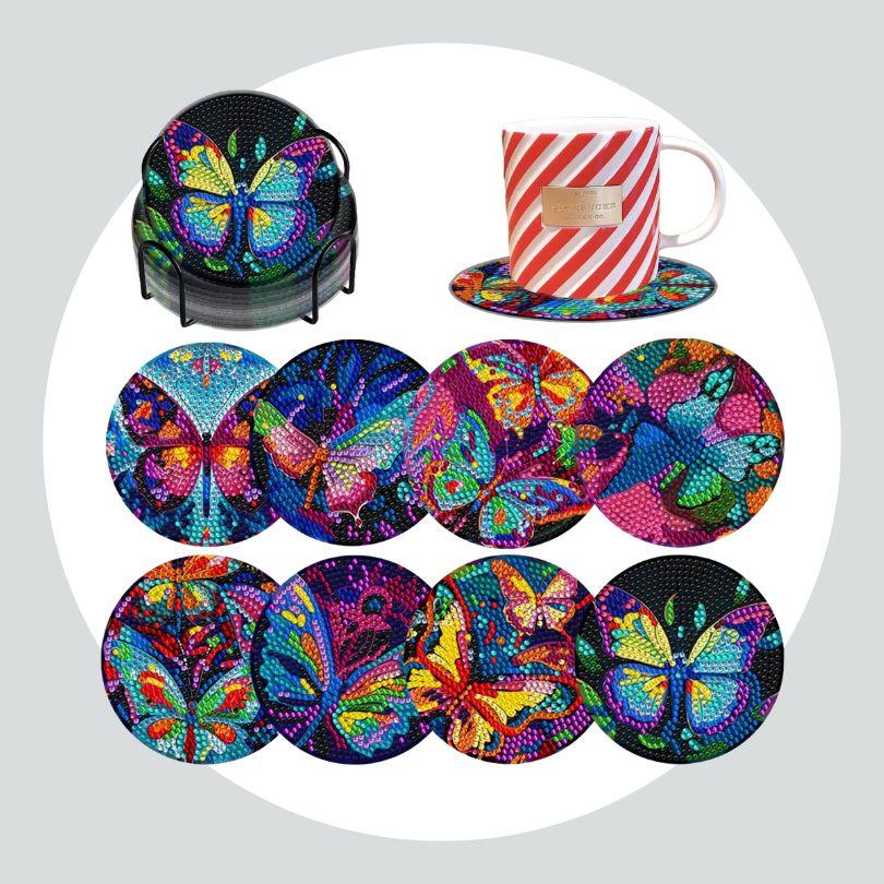 Pintura Terapêutica com Diamantes - Porta Copos (8 unidades) - Borboletas Brilhantes